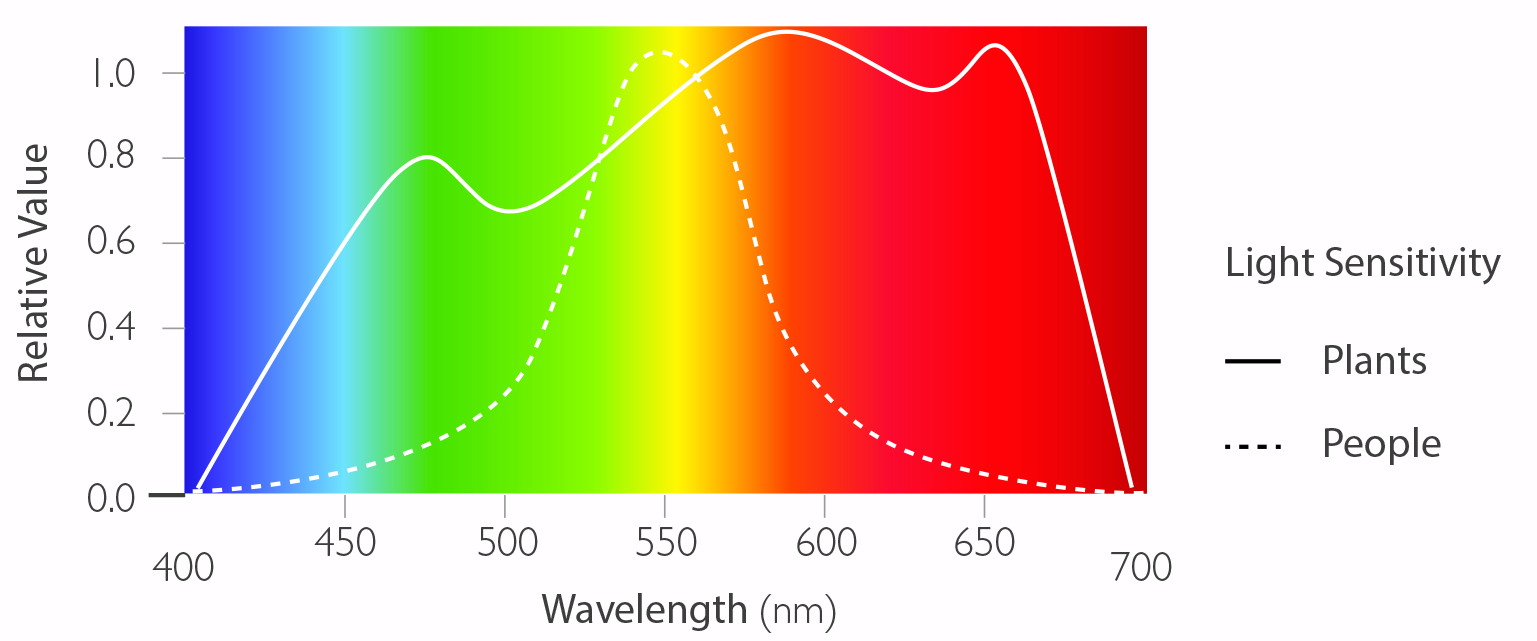 Lumens/Lux are units of measurement based on how humans perceive light intensity. Since humans are more sensitive to green light and not blue and red (which are the colors plants respond most strongly to), these measurements do not accurately measure light within the PAR region and should not be used as metrics for horticultural lighting.
